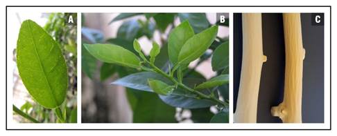 The length of each branch was measured from the base of the plant to its highest point, and the average height per plant was calculated. For stem diameter determination, measurements were taken at 10 cm above the ground. Leaf area was determined in five randomly selected leaves per plant, and analyzed using a LI-3100 leaf area meter (LICOR, USA). All growth parameters measurements were recorded per plant, and the average for each treatment was subsequently calculated. The presence of CTV visible symptoms such as vein clearing, leaf cupping, vein corking, stunting, and their severity were scored according to Garnsey and others24; also, stem pitting was evaluated at the end of experiment.