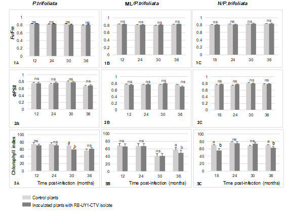The maximum fluorescence yield in dark-adapted leaves (Fv/Fm) remained stable at approximately 0.8 in all treatments throughout the experiment, regardless of plant species or virus infection (Figure 3; 1A, 1B, 1C). Similarly, the quantum yield efficiency in light-adapted leaves (ΦPSII) was not affected (Figure 3; 2A, 2C, 2B). Despite of this, a slight decreasing trend was observed for this parameter in RB-inoculated ML/P. trifoliata plants by the third year post-inoculation.