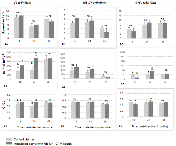 The leaf net assimilation rate (A) did not show significant differences between RB-inoculated and non-inoculated plants throughout the experimental period. However, a reduction in A was observed in ML/P. trifoliata in the last evaluation (Figure 4 ; 1A, 1B, 1C). The stomatal conductance (gs) and Ci/Ca ratio were generally higher in RB-inoculated plants during the early stages of infection (up to 24 months), with P. trifoliata exhibiting the most marked response (Figure 4; 2A, B; 3A, B). Conversely, in RB-inoculated N/P. trifoliata plants, gs and Ci/Ca ratio were lower during the first year post-inoculation (Figure 4; 2C, 3C), but exhibited a similar trend to P. trifoliata and ML/P. trifoliata at 24 months. By the end of the experiment, gas exchange variables showed no significant differences associated with the presence of the virus.