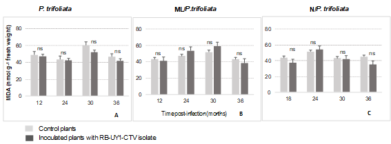 Figure 5: Oxidative damage in response to infection by the RB-UY1-CTV isolate assessed by Malondialdehyde (MDA) concentration in leaf tissue of P. trifoliata seedlings (A), ML/P. trifoliata (B), and N/P. trifoliata (C)