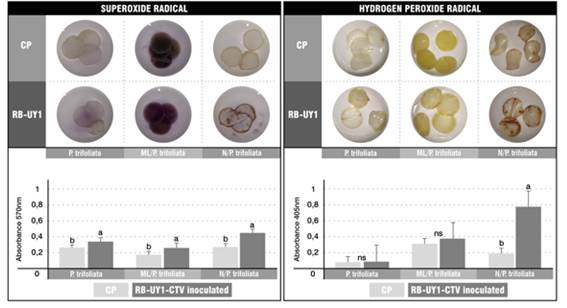 The physiological response induced by the RB-UY1 isolate was evaluated in three plants model: a) P. trifoliata seedlings; b) Mexican lime (ML; Citrus aurantifolia) grafted onto P. trifoliata; and c) Navel orange (N; Citrus sinensis) grafted onto P. trifoliata. Five plants of each combination were inoculated with RB-UY1 isolate, while another set (five plants) of uninoculated combinations remained as control.