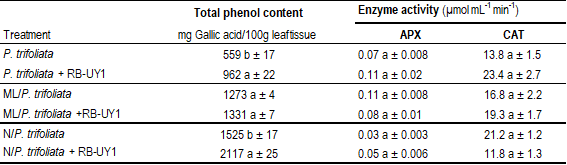 The total phenolic content was significantly higher in RB-inoculated P. trifoliata and N/P. trifoliata plants (Table 1). In contrast, no statistically significant differences were found in enzymatic activity for APX and CAT among control and RB-inoculated plants (Table 1).